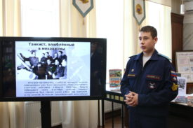 На уроке истории кадеты 85 учебного взвода вместе с преподавателем Евгением Некрытым стали участниками презентации выставки «Герой, Отечества спаситель!».