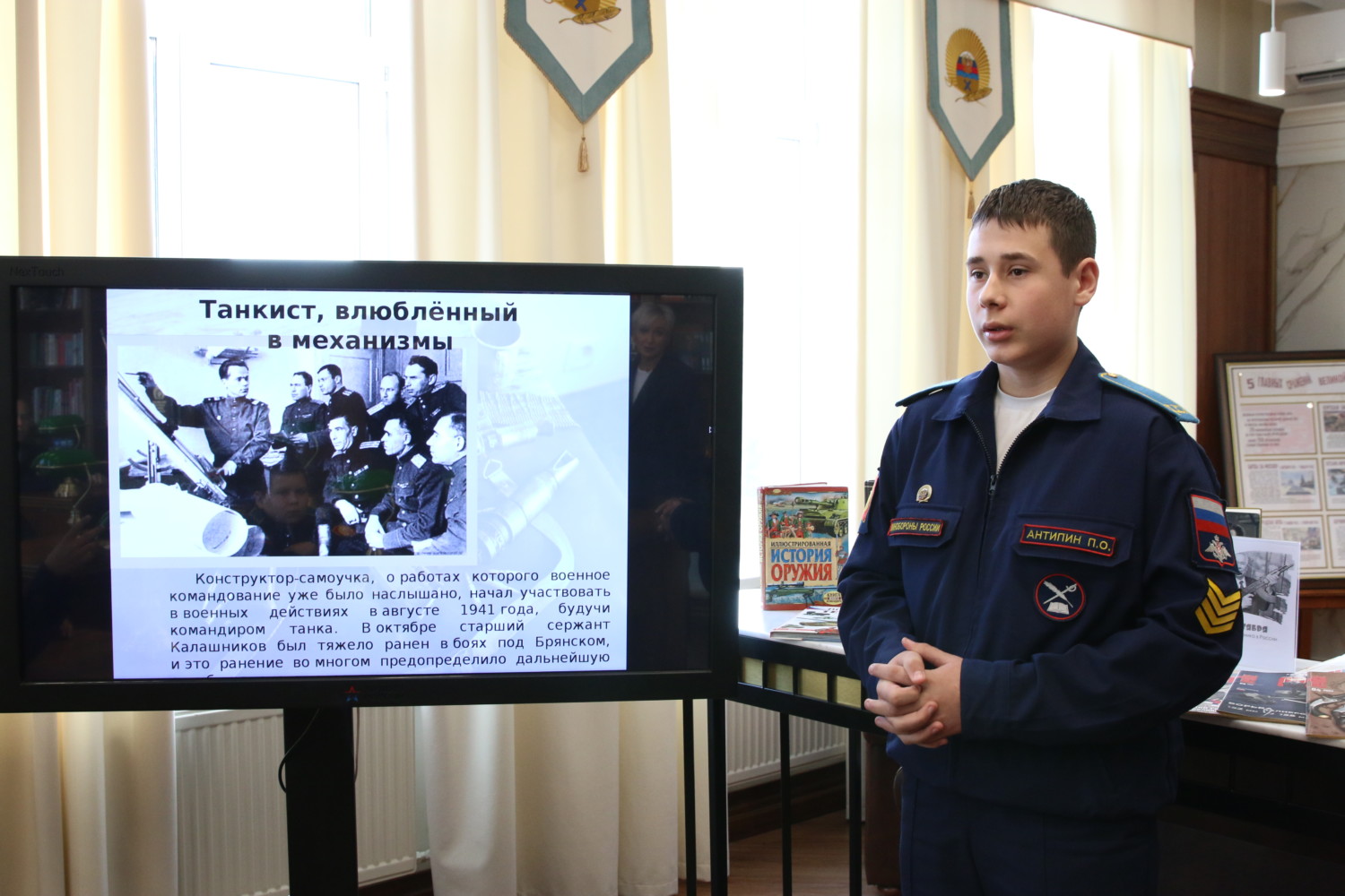 Кадеты 4 курса стали участниками мероприятия в библиотеке, посвященного этому празднику. От заведующей библиотеки Натальи Карзановой ребята узнали об истории возникновения и празднования Дня оружейника. Пятиклассники достойно ответили на вопросы знатока оружейного дела Павла Антипина, кадета 82 учебного взвода, и вместе вспомнили имена выдающихся конструкторов-оружейников, их изобретения. О Михаиле Тимофеевиче Калашникове, конструкторе самого популярного в мире автомата и знаменитом российском оружейнике, чье имя носит 8 учебный курс, Павел рассказывал с гордостью и восхищением. Читать далее