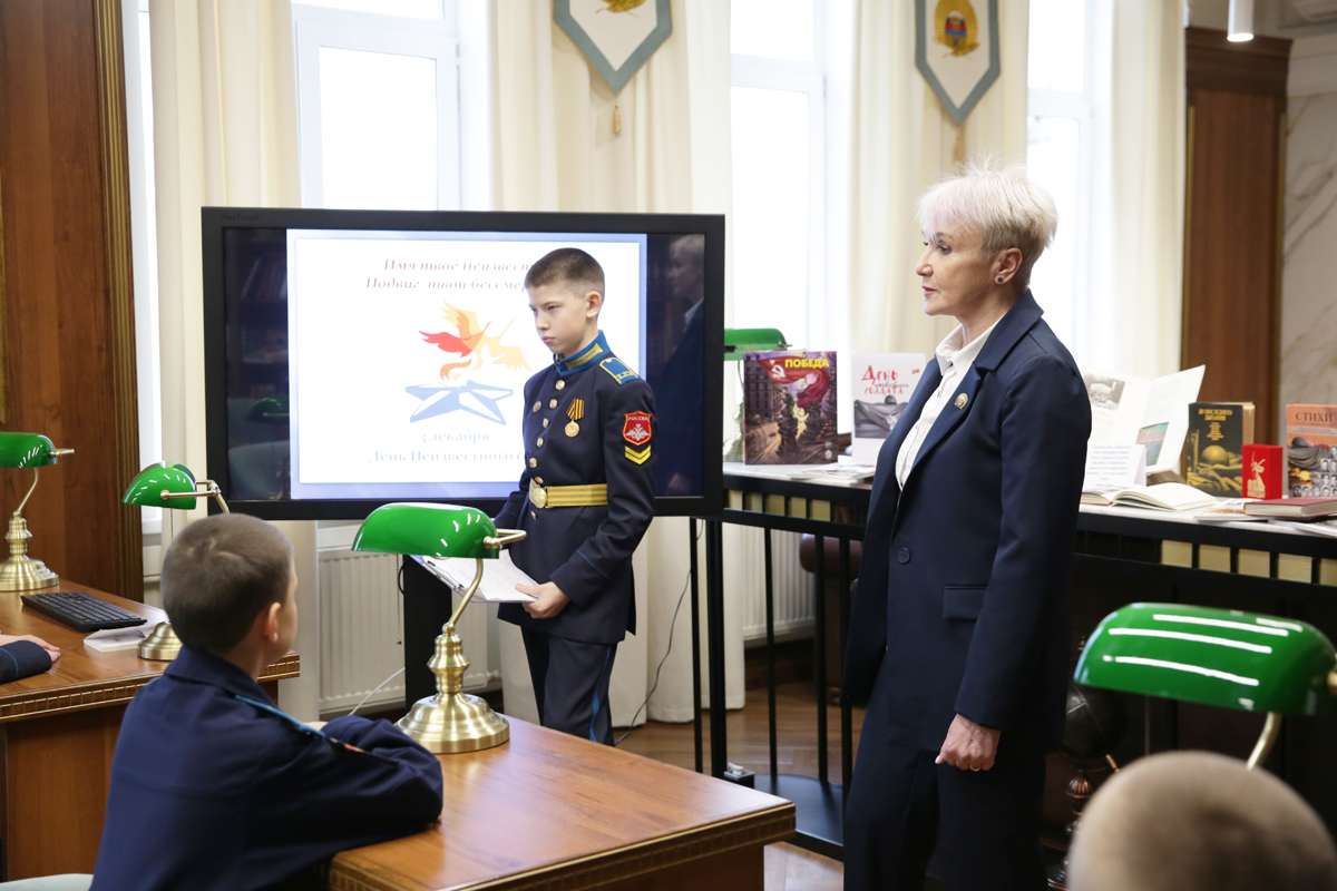 Сотрудники библиотеки Наталья Карзанова и Ольга Князькова познакомили кадет с книгами и стихами о великих сражениях, прозой военных лет и иллюстрациями памятников Неизвестному Солдату в разных городах России.