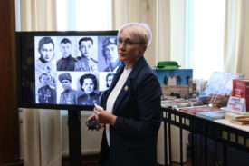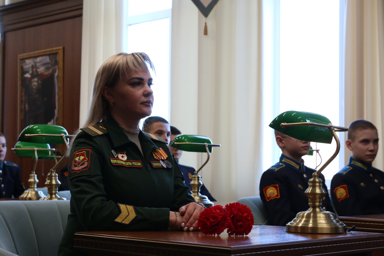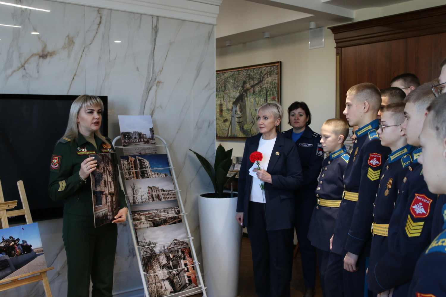 Воспитатель Ольга Грачева представила особого гостя мероприятия — маму кадета 86 учебного взвода Льва Синицина. Светлана Васильевна презентовала фотогалерею своих работ «Война ради мира».