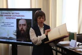 Мероприятие открылось обзором у книжной выставки. Сотрудник библиотеки Ольга Князькова представила многочисленные произведения юбиляра разных годов издания, имеющиеся в фонде библиотеки. Особый интерес у кадет вызвали раритетные книги. Издания в таком исполнении открывают возможность окунуться в историческую эпоху, когда творил писатель, почувствовать особенный эзоповскую манеру письма. Ребят заинтересовало разнообразие писательского багажа и неувядающий интерес к остросатирическим произведениям Щедрина сегодня.